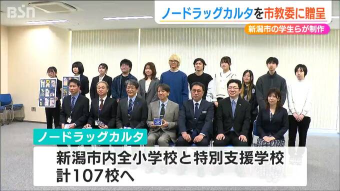 ノードラッグカルタは新潟市内の全小学校と特別支援学校の107校に贈られるということです。