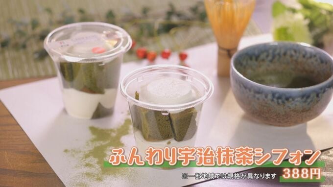 京都特産の“宇治抹茶”を使った『ふんわり宇治抹茶シフォン(388円 ※一部店舗で販売がない可能性があります)』。コクのある生クリームを合わせた贅沢な逸品。