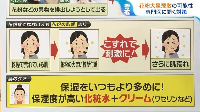 乾燥で荒れている肌に花粉の大きな粒が付着すると、こすれて刺激になってしまい、さらに肌荒れをひき起こしてしまいます。