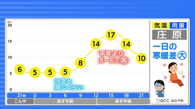 きょう11日(火)の広島県内は、午前中まで気圧の谷や湿った空気の影響が残り、広い範囲で雨や雪が降りました。午後になると日差しが届き、夕方に最高気温を記録した地点が多くなりました。広島市中区で最高気温は14.8℃ 加計で15.1℃となり、過ごしやすい陽気になりました。