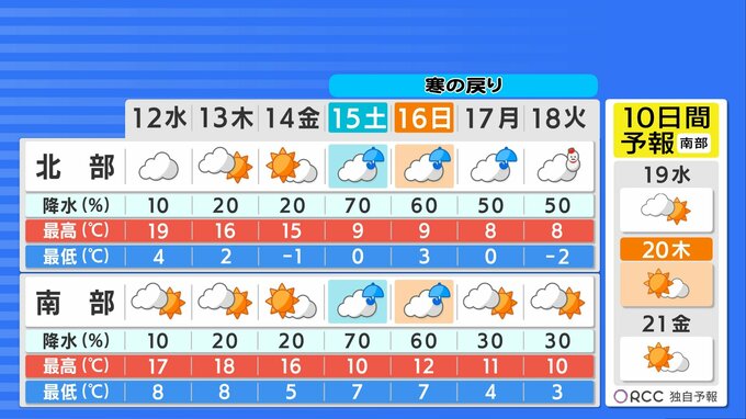 金曜日にかけて晴れ間があり、日中の気温は15℃を超えて上着いらずの暖かさになりますが、週末は広い範囲で本降りの雨となりそうです。土曜日以降は寒の戻りとなり、来週前半は北部で雪が降る可能性もあります。短い期間で気温変化が非常に大きくなるので、体調管理にはご注意ください。