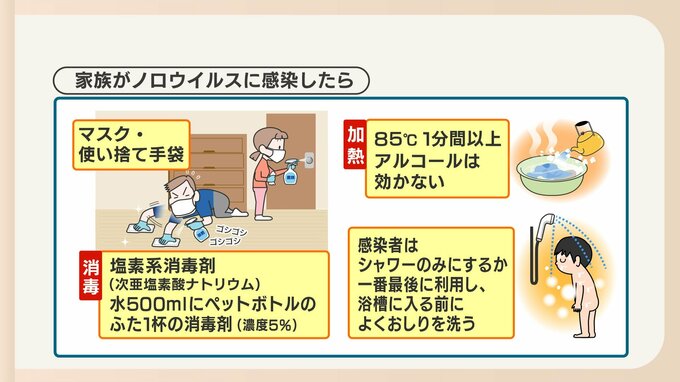 家族がノロウイルスに感染した場合、感染者が使ったり、おう吐物がついたものはゆか、ドアノブ、カーテンなども塩素系消毒剤で消毒します。