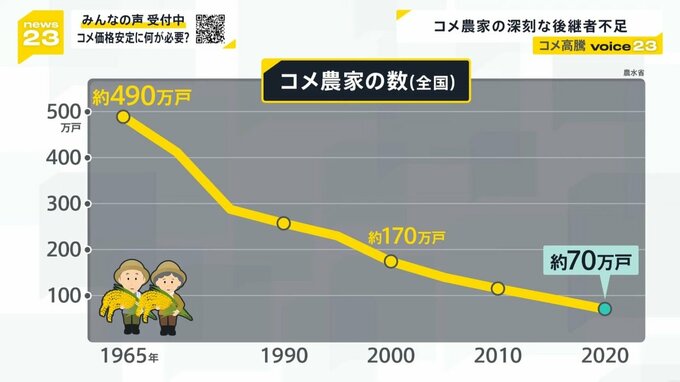 コメ農家の数は、2020年には約70万戸となり、50年で7分の1に減少しました。