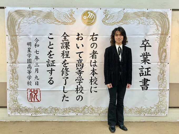 典親さんは「3月9日,明星学園高等学校を卒業しました」と、大きな卒業証書をバックした写真を投稿。