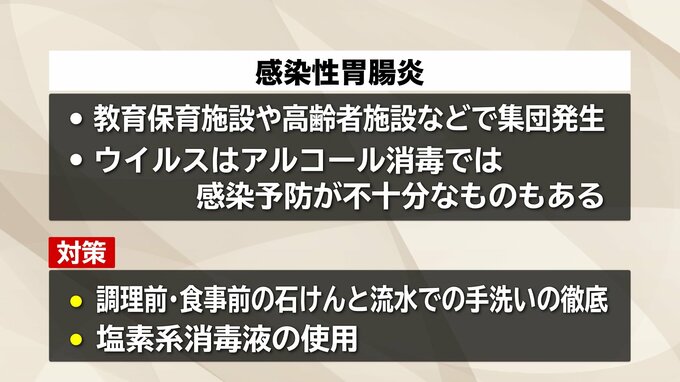感染性胃腸炎を引き起こすウイルスはアルコール消毒では、感染予防が十分でないものもあり、県は、調理前・食事前の石けんと流水での手洗いの徹底や、塩素系消毒液の使用などを呼びかけています。