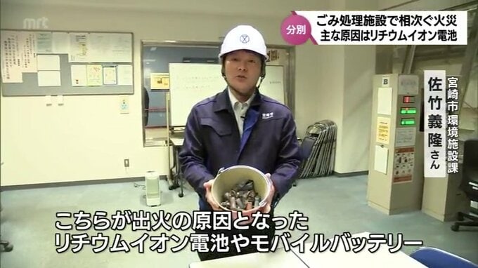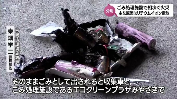 「リチウムイオン電池は、スマートフォン、電動工具、おもちゃなどに広く使われているので、そのままゴミとして出されると、収集車とゴミ処理施設であるエコクリーンプラザみやざきで火災の原因になりますので、適切に分別して出していただきたい」