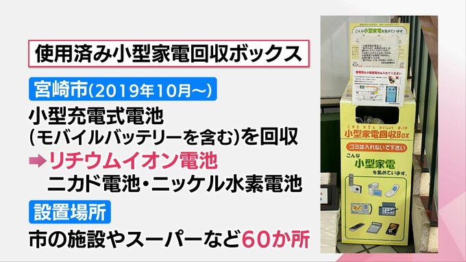 宮崎市では、2019年10月から、リチウムイオン電池を含む「小型充電式電池」を専用のボックスで回収しています。