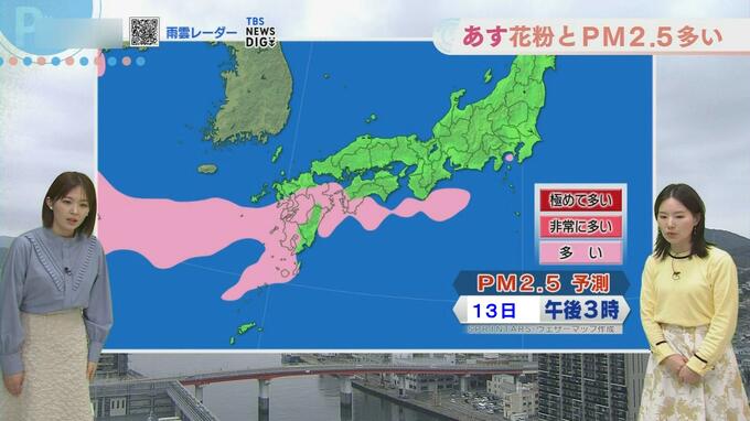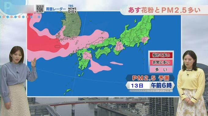 13日(木)は花粉に加えてPM2.5も多い予想です。西日本を中心に「多い」予測となっています。呼吸器や循環器に疾患のある方は体調の変化に注意して時間を過ごす必要がある程度の濃度になります。外出を控えるなどの対策をしてください。