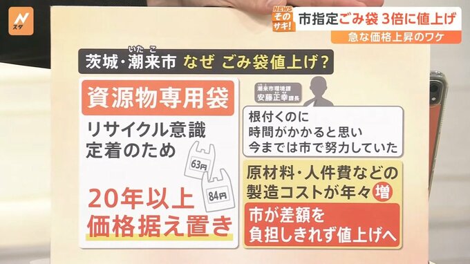 潮来市環境課の安藤正幸課長は「根付くのに時間がかかると思い、今までは市で努力していた」と話しています。しかし、原材料・人件費などの製造コストが年々増加し、市が差額を負担しきれず値上げしたということなんです。