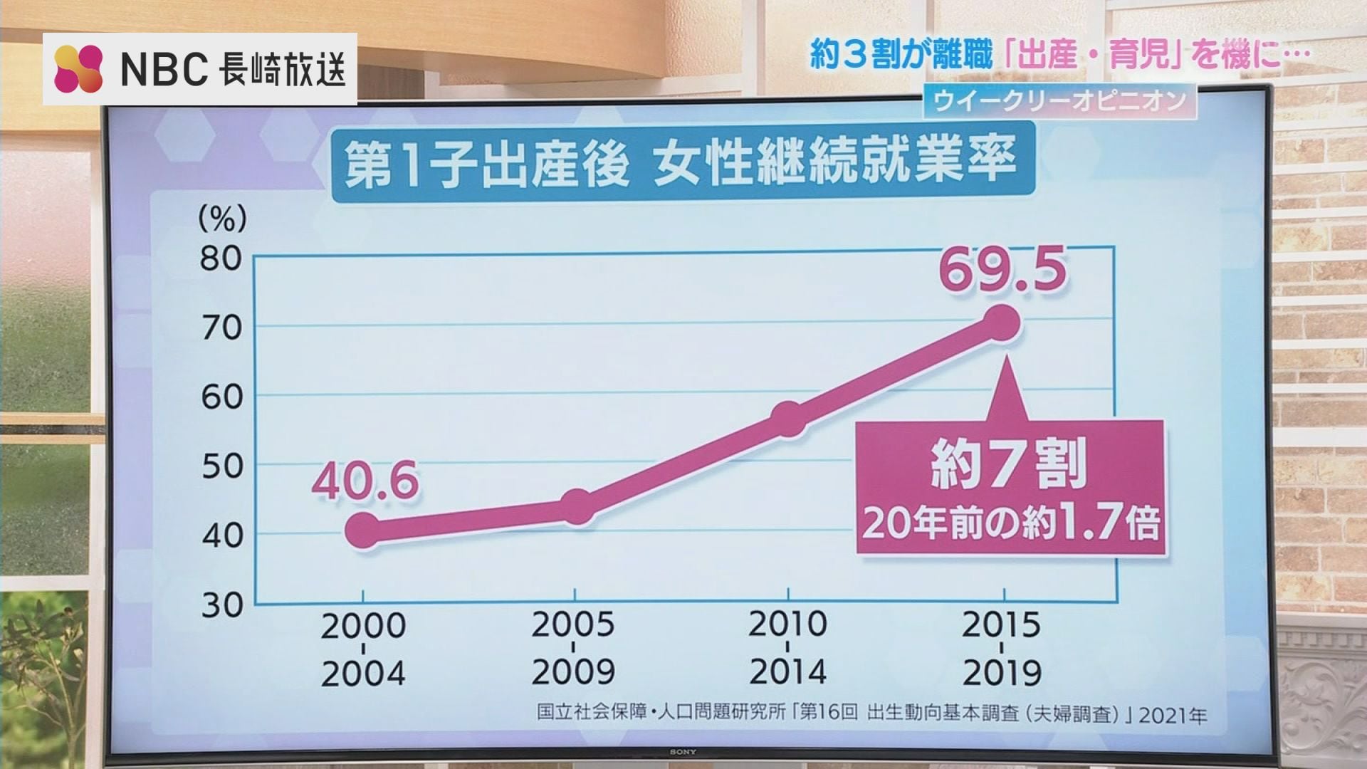 【平】国立社会保障・人口問題研究所によると、第一子の出産前後に仕事を継続している女性は全体のおよそ7割で、20年前のおよそ1.7倍に増えています。逆に言うと、3割は出産・育児を機に離職をしていることが分かります。