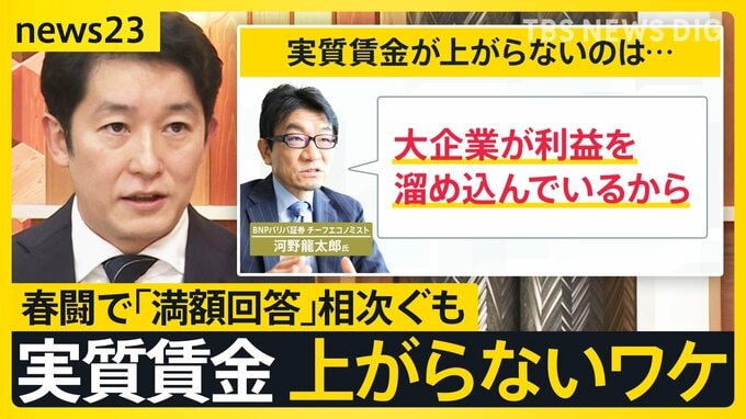 今年の春闘の集中回答日となった12日。大企業からは去年に引き続き「満額」の回答が相次ぎました。一方で、マクドナルドや、すき家が値上げを発表するなど値上げの波は収まりません。賃上げを実感できない原因はど…