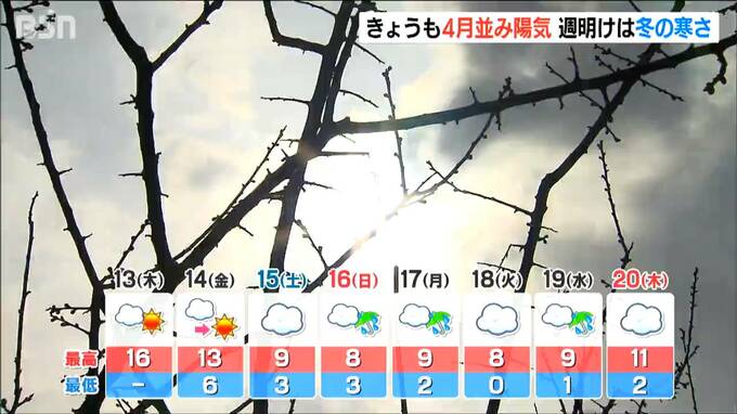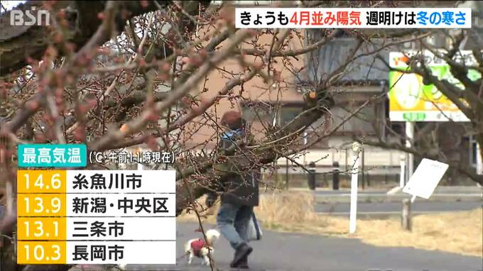 13日も新潟県内は気温が上がり、新潟市は予想最高気温が15℃と4月中旬並みの暖かさとなりそうです。