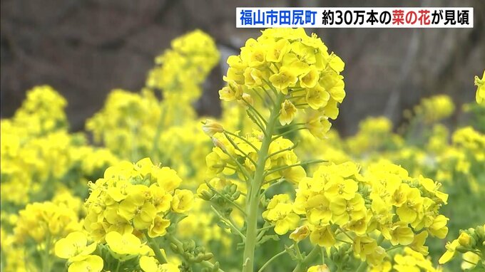 福山市田尻町にある「観光菜の花畑」です。およそ35アールの敷地に植えられた、30万本ほどの菜の花が見頃となりました。