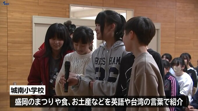 城南小学校はグループごとに盛岡のまつりや食、お土産などについて英語や台湾の言葉で紹介しました。