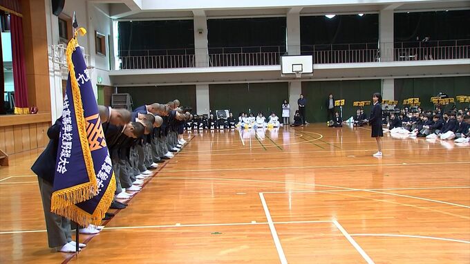 選抜旗を手にした山田主将を先頭に、野球部の選手たちが入場してきました。2年ぶり29回目となるセンバツ出場を決めた高松商業です。壮行会では、生徒を代表して生徒会長の佐々木奏音さんが激励の言葉を贈りました。