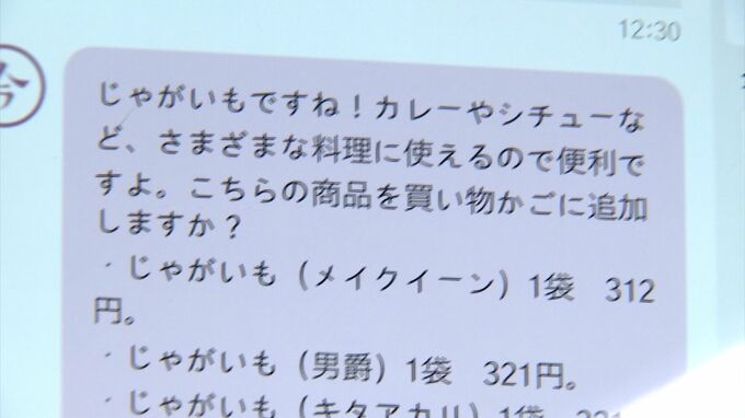 利用者の質問に答えるのは生成AIです。対話型の買い物支援サービス「こんにち商店」です。坂出市の通信事業会社やJA香川県、コープかがわなどが連携して取り組んでいるもので、直売所の農産物やコープで扱う約1400品目の商品を自宅まで配送してくれます。