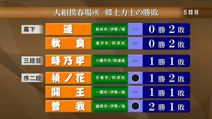 大相撲春場所5日目郷土力士の取り組みの結果です。