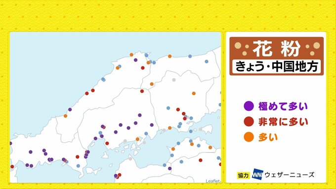 きょう13日(木)の広島県内は、雲が多い一日になりました。きょうも4月並の暖かさが続き、気温が高くなりました。最高気温は広島市中区で18.4℃ 蒲刈で17℃を記録し、今年一番の暖かさになりました。そしてきょうは花粉が大量飛散した一日でした。RCC屋上に設置している花粉観測機「ポールンロボ」はことし設置してからはじめて、極めて多い観測となりました。他の中国地方の観測地点も多くの地点で極めて多い観測となりました。