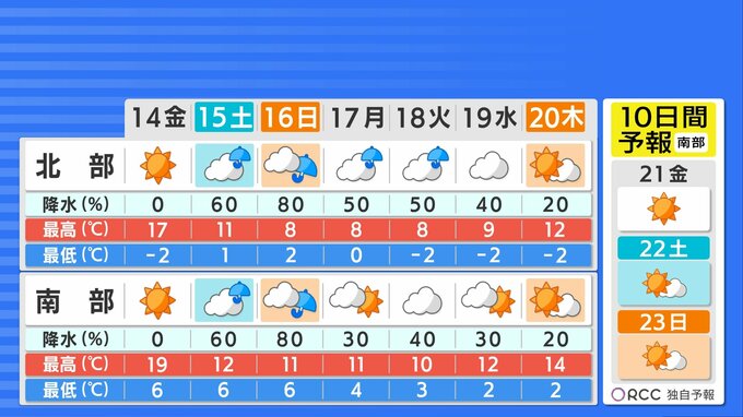 4月並の暖かさはあすまでで、週末は雨が降り寒の戻りとなります。特に来週前半にかけて平地でも雪が降る目安の寒気が入り、北部を中心に雪が降るところがある見込みです。日中の気温は土曜日以降一気に2月並となり、冬の寒さに逆戻りします。短い期間で気温変化が非常に大きくなるので体調を崩さないようご注意ください。