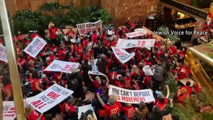 イスラエルのガザ侵攻に抗議するデモを主導したとして拘束された元大学院生の釈放を求め、デモ隊がニューヨークのトランプタワーを一時占拠しました。記者「トランプタワーの中で抗議活動をしていた人が、警察に拘…