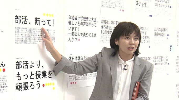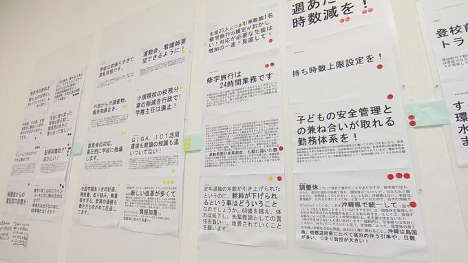 今月那覇市で開催されたイベント「先生たちのSOS」。教員たちの悲痛な声が100枚以上のパネルで展示されています。