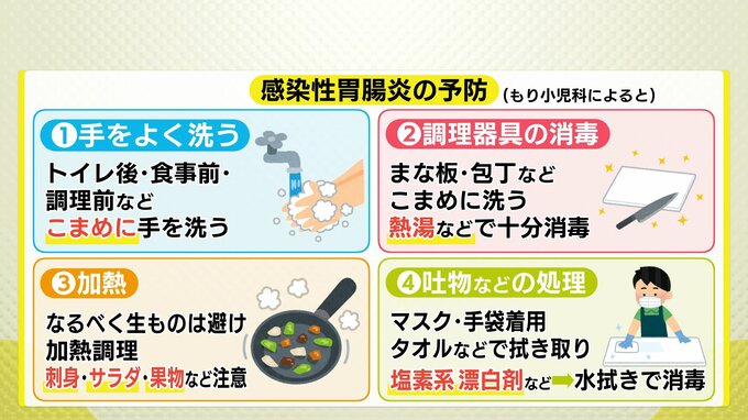 広島県は13日に「感染性胃腸炎警報」を出しましたが、広島市のクリニックでは嘔吐や下痢などを訴える人が相次いでいます。医師にウイルスの特徴と予防策を聞きました。