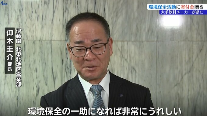 岩手県内の環境保全活動に活用してもらおうと、大手飲料メーカーが県に寄付金を贈りました。