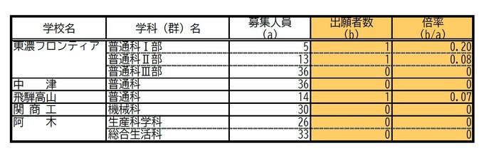 【岐阜県公立高校入試2025】合格者が募集に満たない学校の「第二次選抜」全日制・定時制課程の志願者数・出願状況一覧