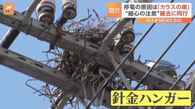 停電の原因は「カラスの巣」。撤去作業に同行しました。