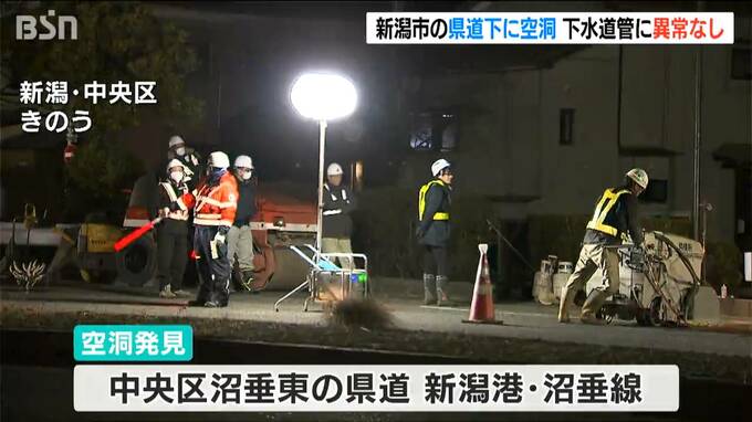 新潟市中央区の県道で14日、道路下に空洞があるのが見つかりました。復旧工事は終わり安全は確保されています。下水道管に異常はなく、原因は調査中だということです。