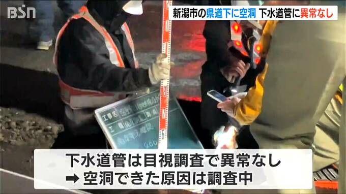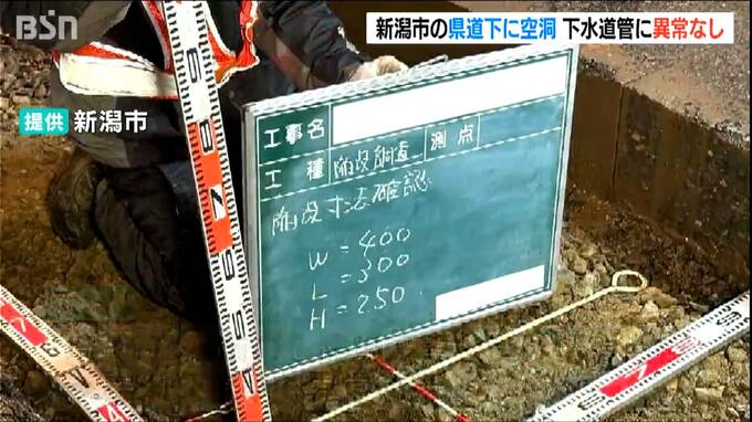 新潟市によりますと、14日夜から調査を行ったところ、路面の下25cmの砂利の部分で、長さ30cm、幅40cm、深さ25cmの空洞があるのが確認されました。