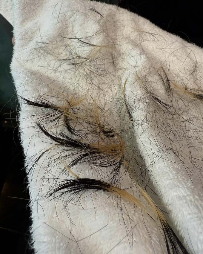 続けて「ショックで一瞬固まりました。髪が抜け落ちるのが止まらないのです。髪の毛を、引っ張っても引っ張っても、ずっと私の髪は抜け続ける。」と、抜け落ちた髪の写真をアップしました。