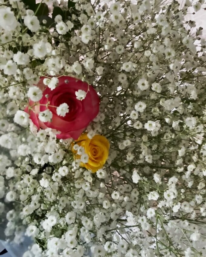 杉浦さんは「ホワイトデーに毎年贈ってるお花」と書き出し、かすみ草の中に2輪のバラという花束の写真を投稿し、「かすみ草の中に、いつもはバラを一輪なんだけど、今年はベビちゃんがおなかにいるから、バラを二輪」と綴りました。そして「寝やすいように抱き枕もプレゼントしたよ」と報告しました。