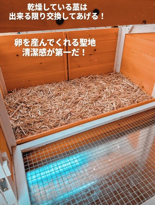 さらに続く投稿で、「乾燥してる藁は出来る限り交換してあげる!」と、にわとり小屋の画像を投稿。