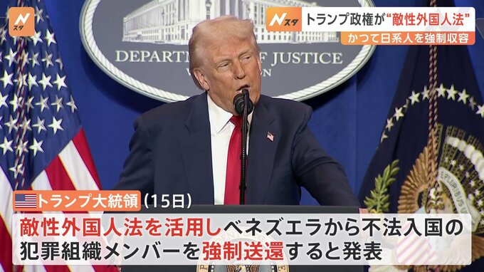 アメリカのトランプ政権はベネズエラの犯罪組織のメンバーの強制退去を行うため、かつて日系アメリカ人を強制収容した際にも使われた敵性外国人法を活用すると発表しました。トランプ大統領は15日、1798年に制定さ…