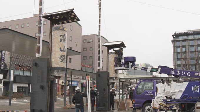きょうはJR高山駅前に「飛騨高山祭」と書かれた高さおよそ15メートルの大きなのぼり旗2本と大提灯(おおじょうちん)が設置されました。