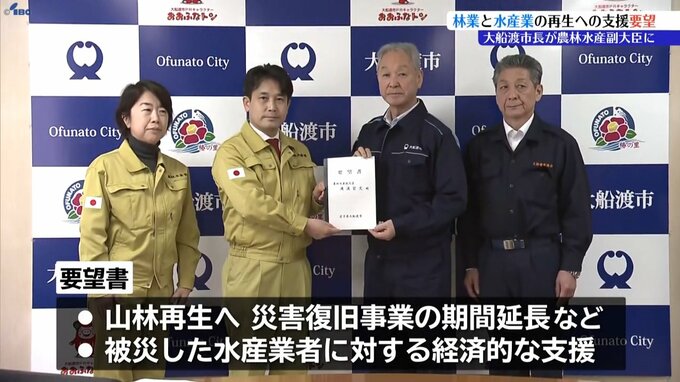 その山林火災の被害を巡っては、大船渡市の渕上清市長が林業と水産業の再生への支援を求めた要望書を、農林水産副大臣に手渡しました。
