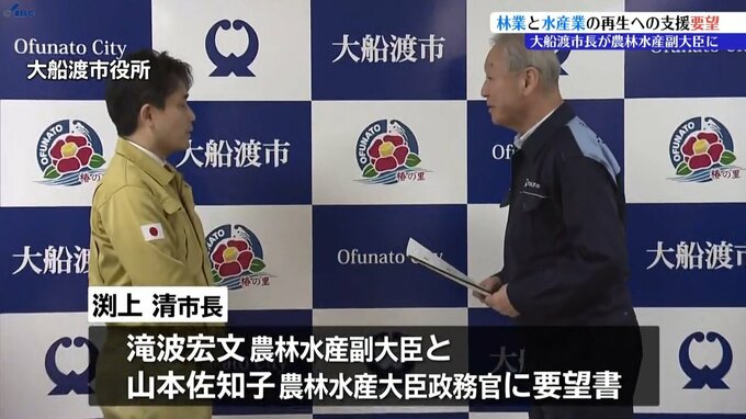 17日は滝波宏文農林水産副大臣と、山本佐知子農林水産大臣政務官が大船渡市役所を訪れ、渕上市長が2人に要望書を提出しました。