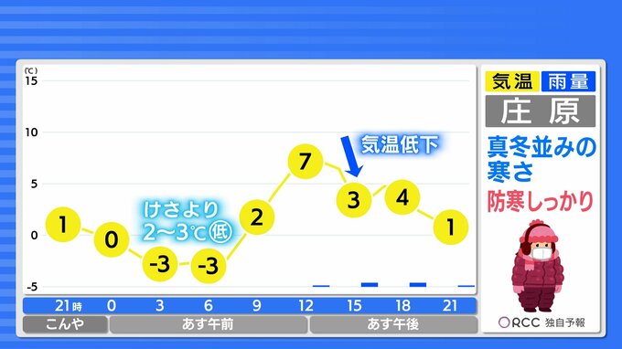 寒気を伴った低気圧が通過した後気温が大きく下がる予想です。あすの日中は真冬並の寒さですので、真冬並みの防寒対策を引き続きお願いします。この先あさってにかけて不安定な天気が続き、真冬のような寒さが続きますが、木曜日以降はおおむね晴れて一気に春本番の暖かさになるでしょう。短い期間で気温変化が非常に大きくなるので体調を崩さないようご注意ください。