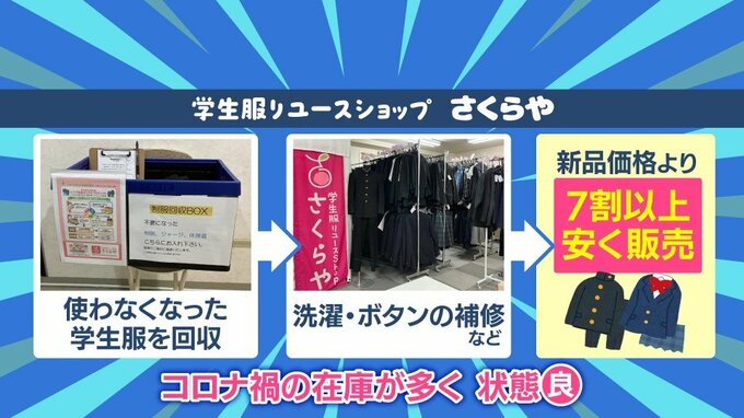 札幌豊平区で学生服をリユースしている「さくらや」では、店頭に回収ボックスを置いて使わなくなった学生服を寄付してもらい洗濯やボタンの補修などをして販売をしています。