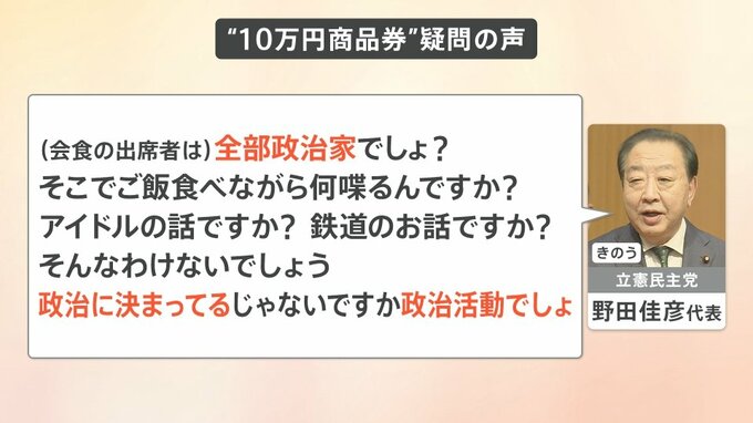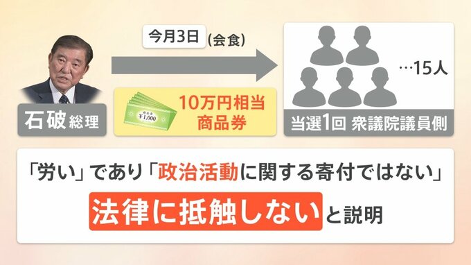 3月3日、当選1回の衆議院議員15人と石破総理は会食を行いました。この15人に、総理側から一人10万円相当の商品券が配られたということです。