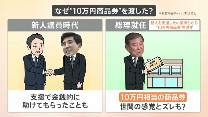 中島官邸キャップによると、石破総理が新人議員時代に、支援で金銭的に助けてもらったことがあったことから、総理に就任して新人を支援したいと“10万円商品券”を渡したとみられています。