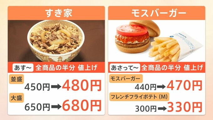 「すき家」牛丼(並盛)450円→480円 「モスバーガー」440円→470円