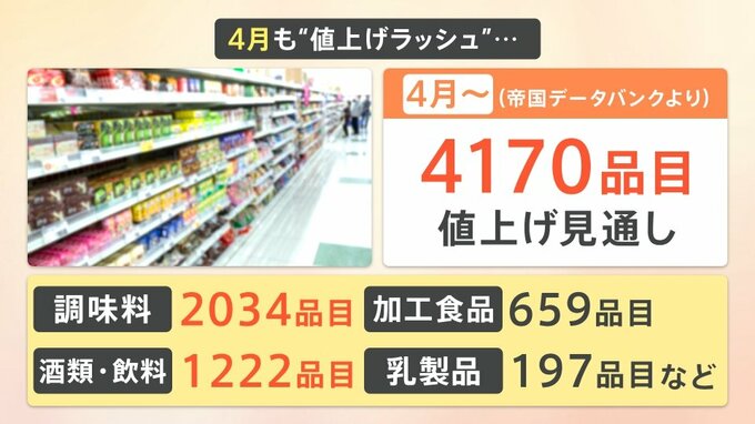 帝国データバンクによると、4月から4170品目が値上げの見通しだということです。