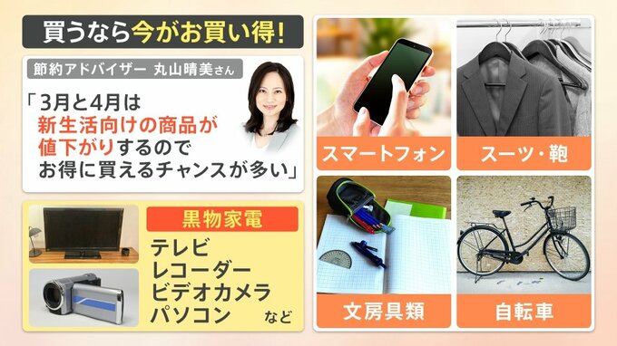 節約アドバイザーの丸山晴美さんによると、「3月と4月は新生活向けの商品が値下がりするので、お得に買えるチャンスが多い」ということです。