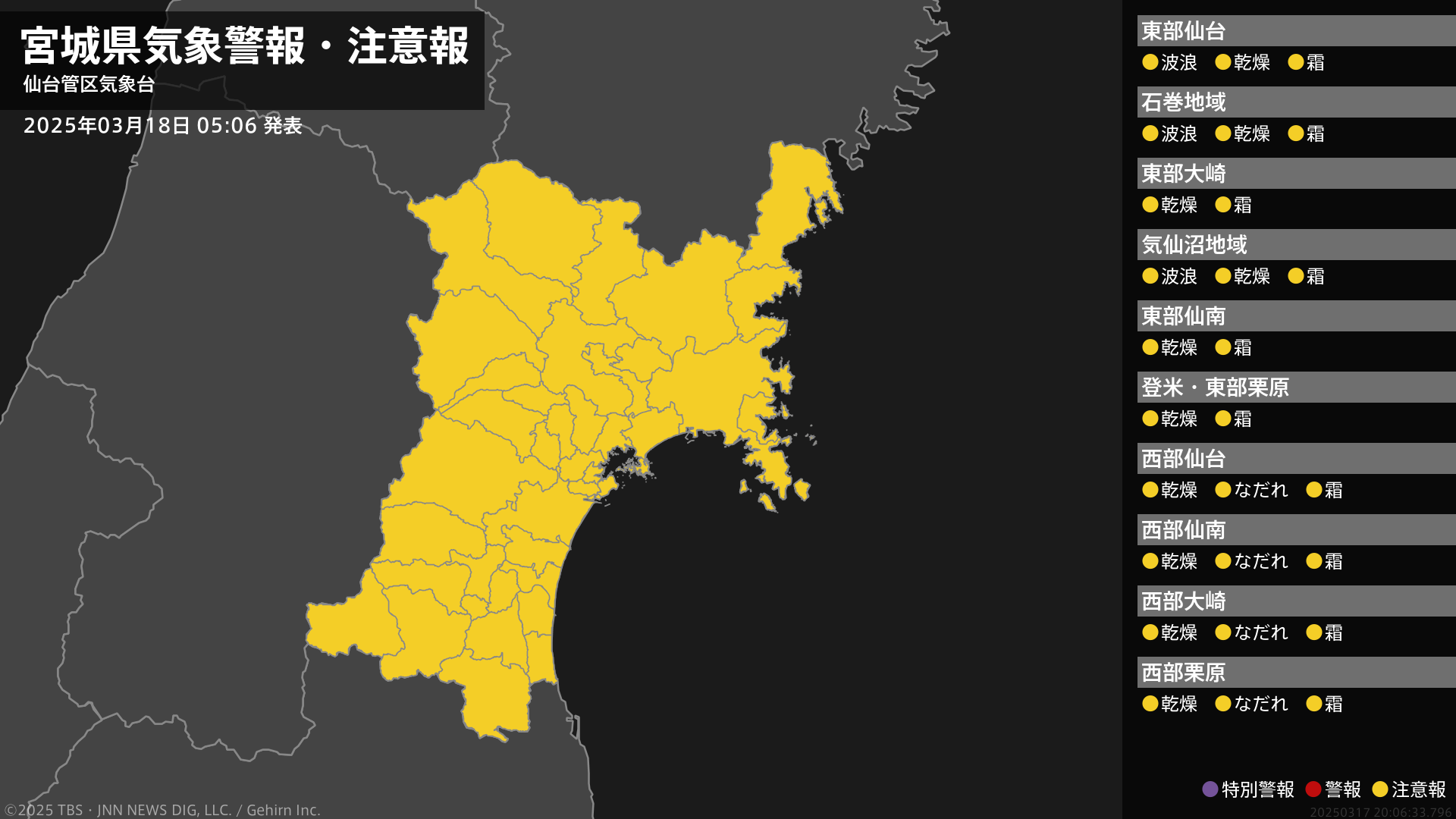 気象台は、午前5時6分に、なだれ注意報を仙台市西部、白石市、栗原市西部、大崎市西部、蔵王町、七ヶ宿町、川崎町、大和町西部、色麻町、加美町に発表しました。