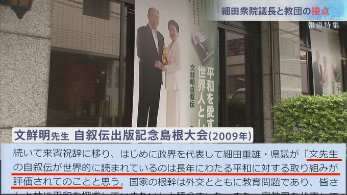 20年ほど前から少なくとも35回、関連イベントに参加していたとの記載が確認できたが、重雄氏は「宗教色を抱いて平和大使なんかできませんから」と答えている。