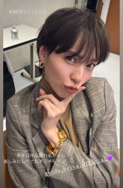 戸田恵梨香さんは、「来年は作品観れるからね 楽しみにしててねチュチュチュ」と綴ると、自身の写真をアップ。