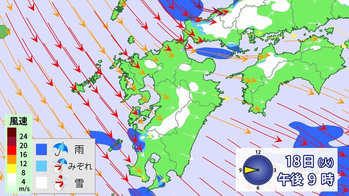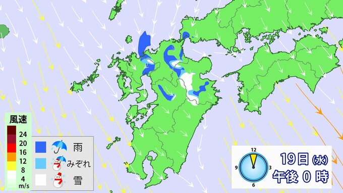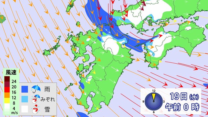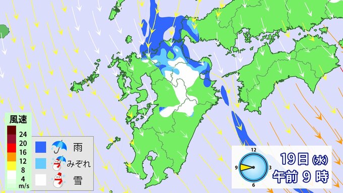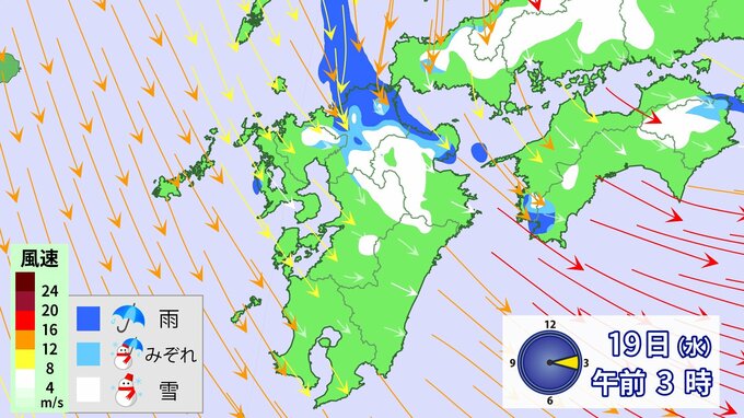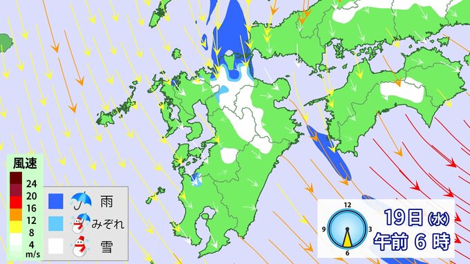 九州北部地方では、19日昼前にかけて山地を中心に大雪となるおそれ、雷や竜巻などの激しい突風、降ひょうのおそれがあります。