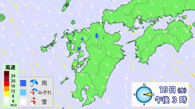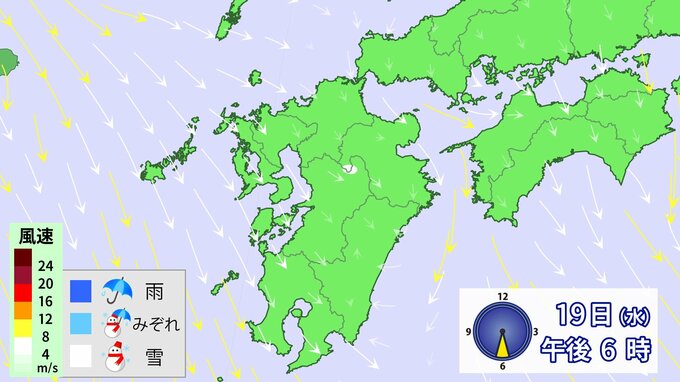 九州北部地方の沿岸の海域では、19日明け方にかけて、雪を伴った西のち北の風が非常に強く吹くとみられています。